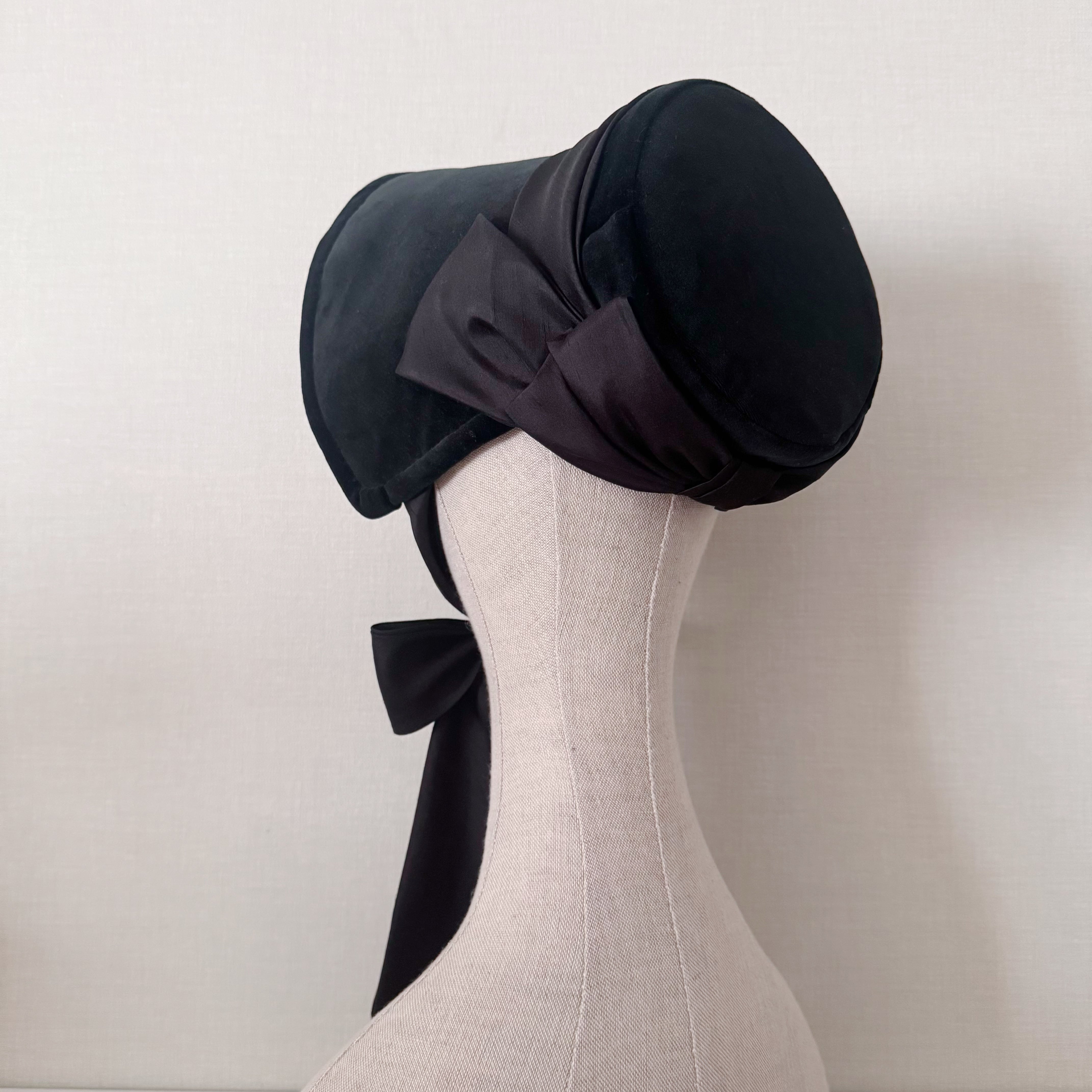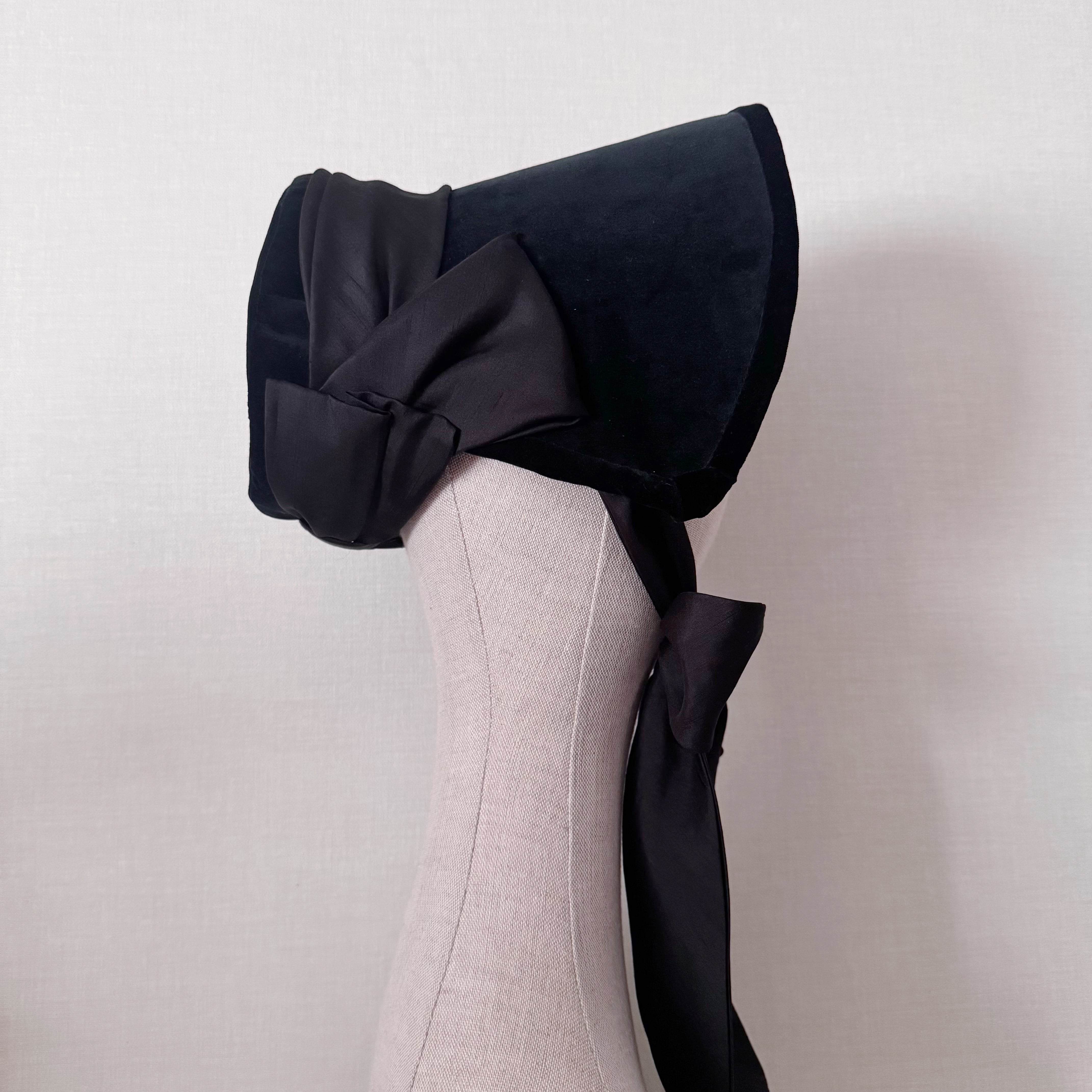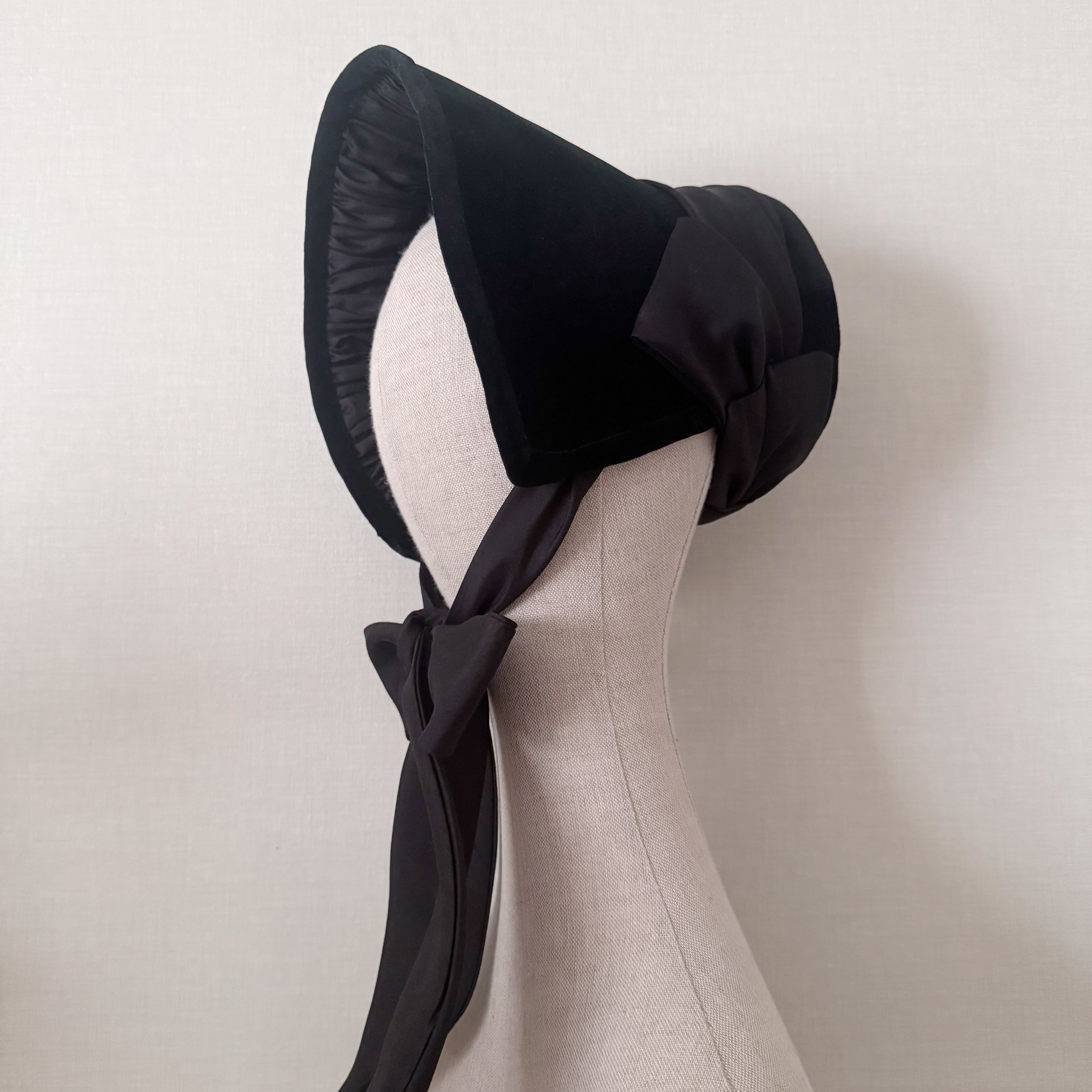 19世紀アンティークの雰囲気を再現したヴィクトリアンボンネット。 質の良いベルベティーン生地を使用しました。 リボンと裏地はシルクシャンタンになります。 ブリム内側のギャザーを楽しんでいただけるデザイン。 工程の9割以上を手縫いで製作しているコレクティブルなアイテムです。 サイズフリー クラウン直径約15〜17cm クラウン高さ約5cm ブリム幅約15〜17cm 日本製
