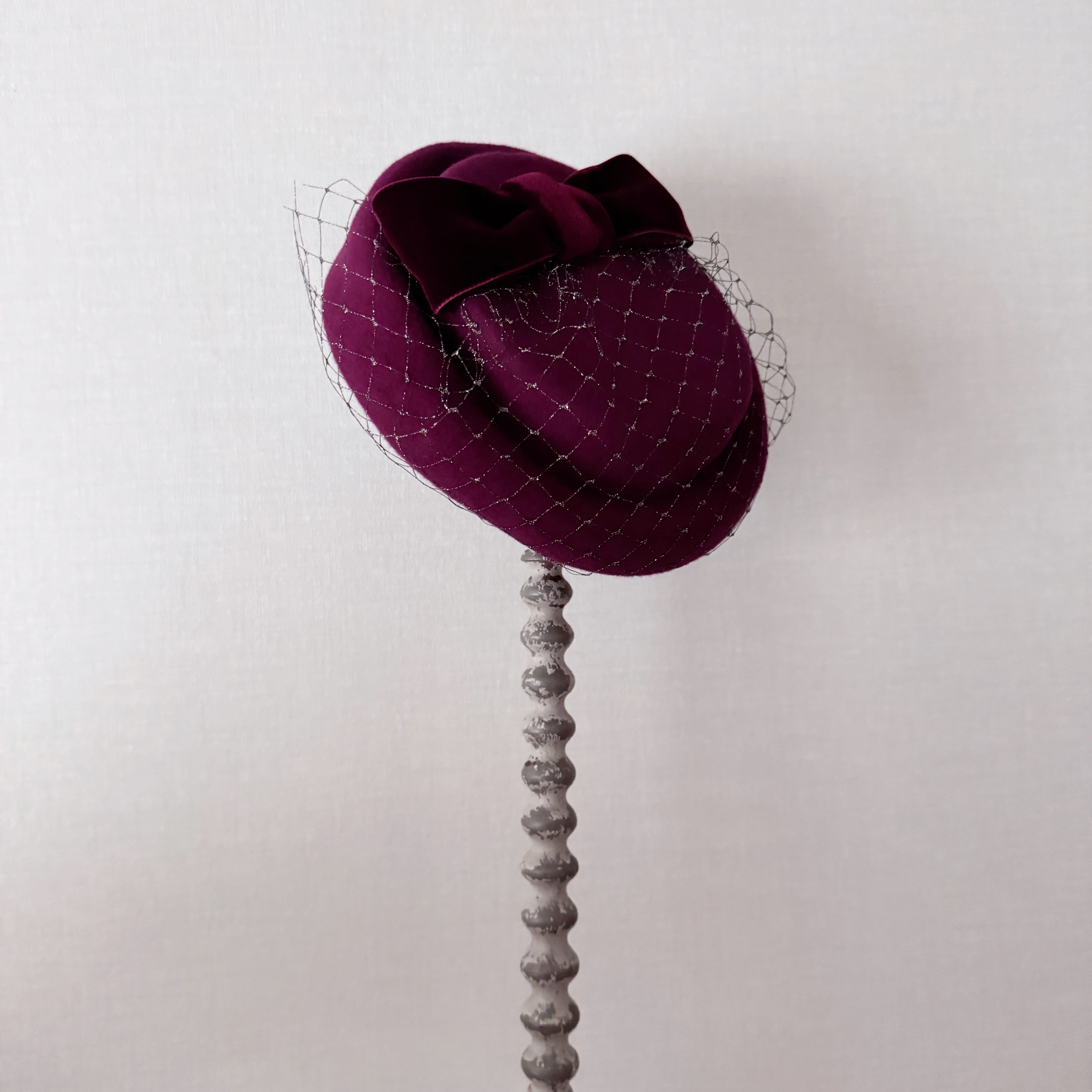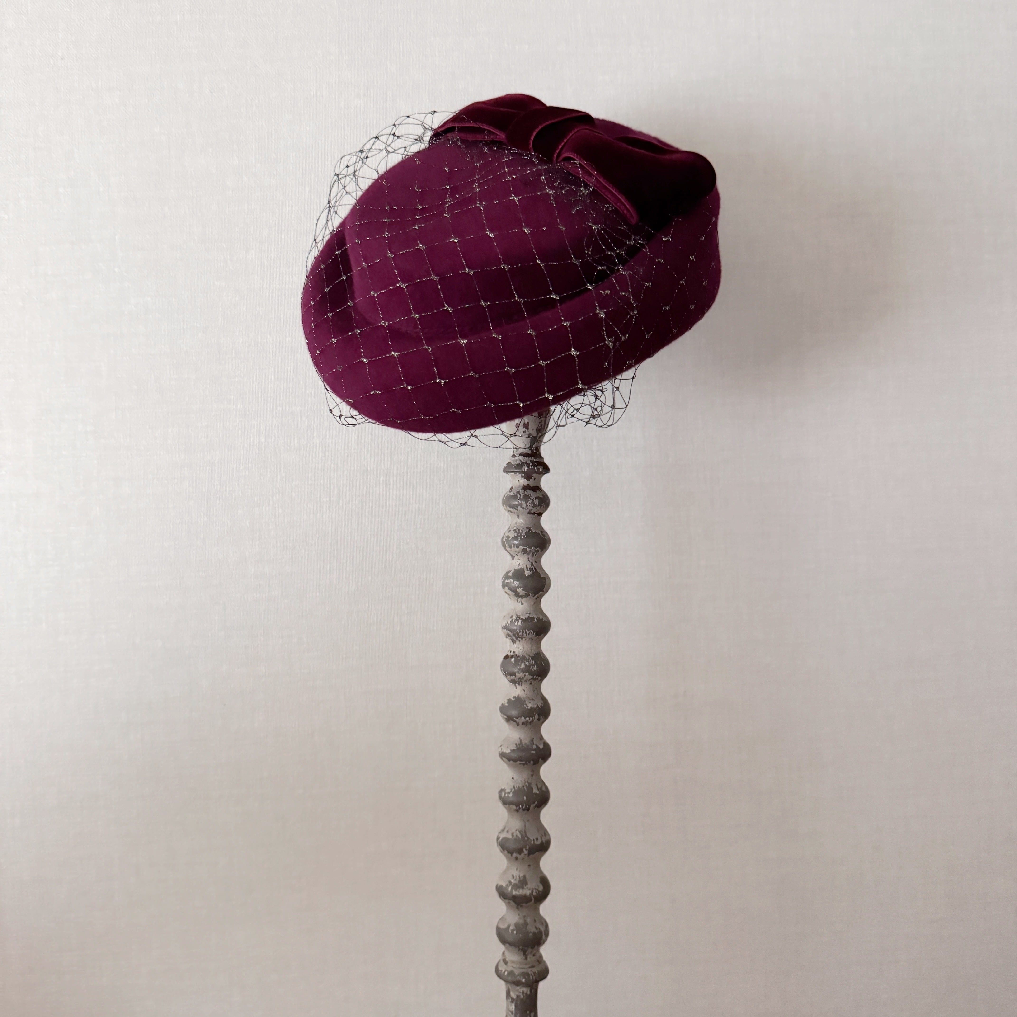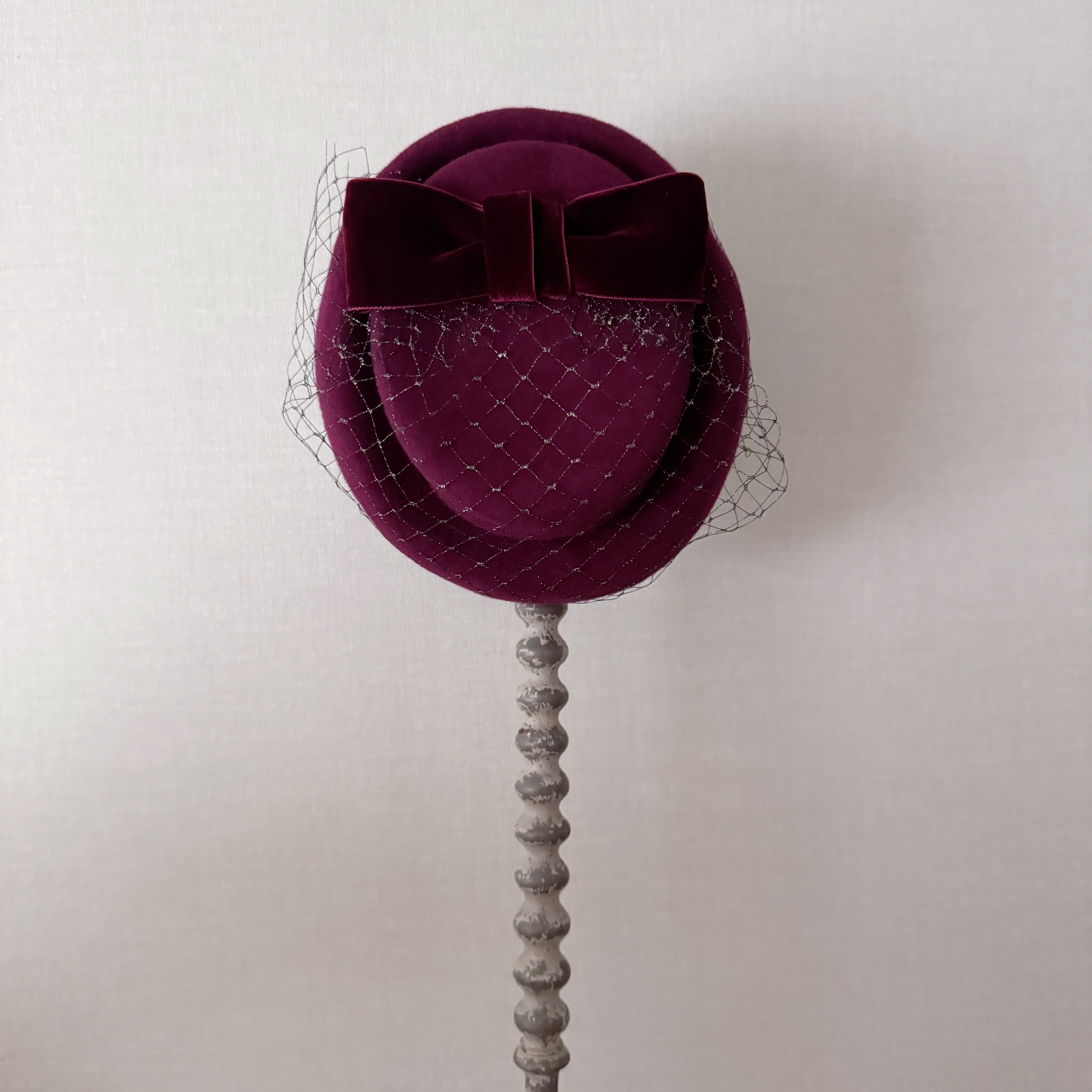 深いボルドーカラーが印象的な、小さな帽子のようなトークハット。 上質なポーランドベロアにゴールドヴェールを重ね、ベルベットリボンを添えてクラシカルに仕上げました。 光の加減で柔らかく艶めく質感が、顔まわりを上品に引き立てます。 アンティークスタイルや特別な装いに寄り添う、時を超えて愛される一点です。 サイズフリー 本体最大幅約21cm 高さ約6cm ポーランドベロア コーム付き