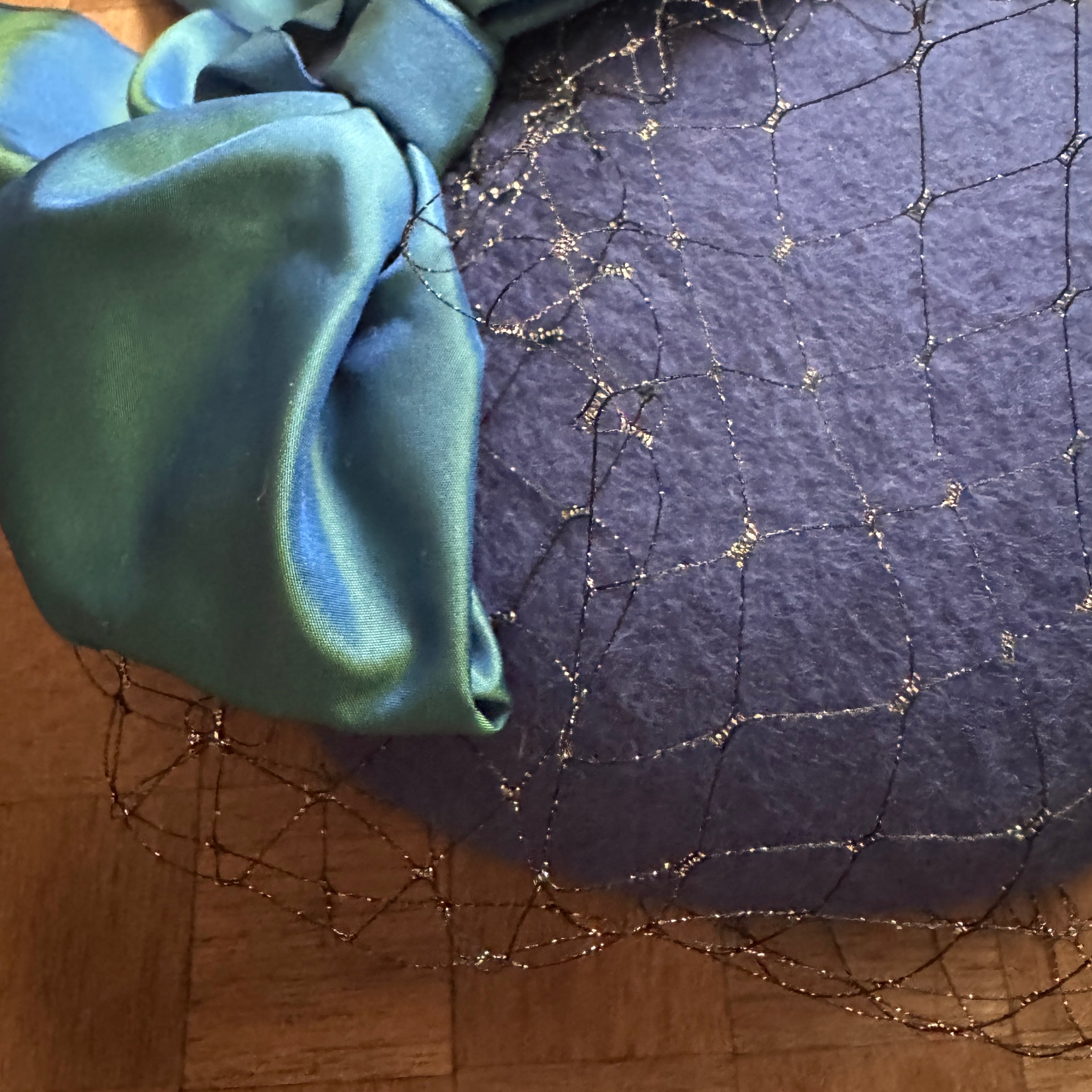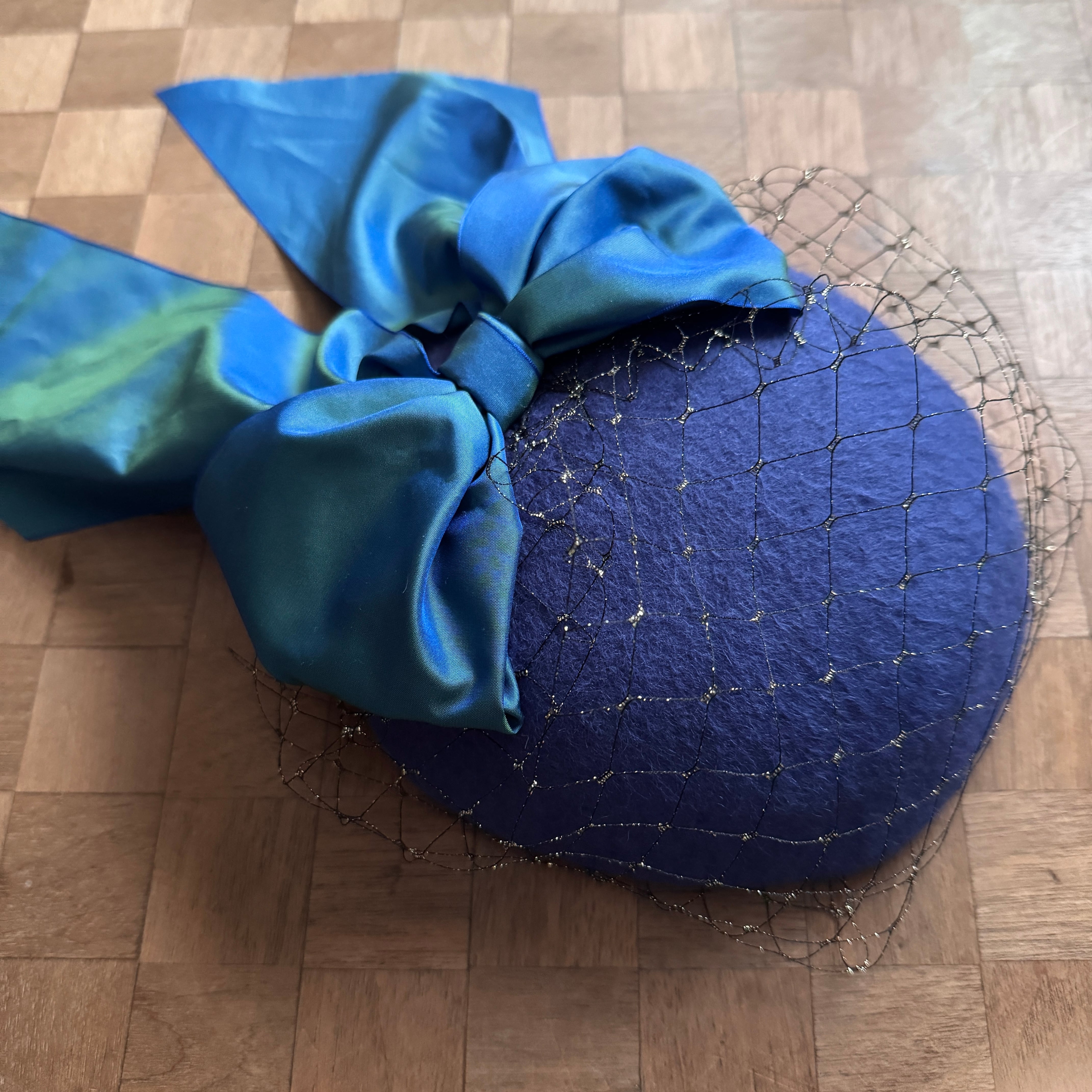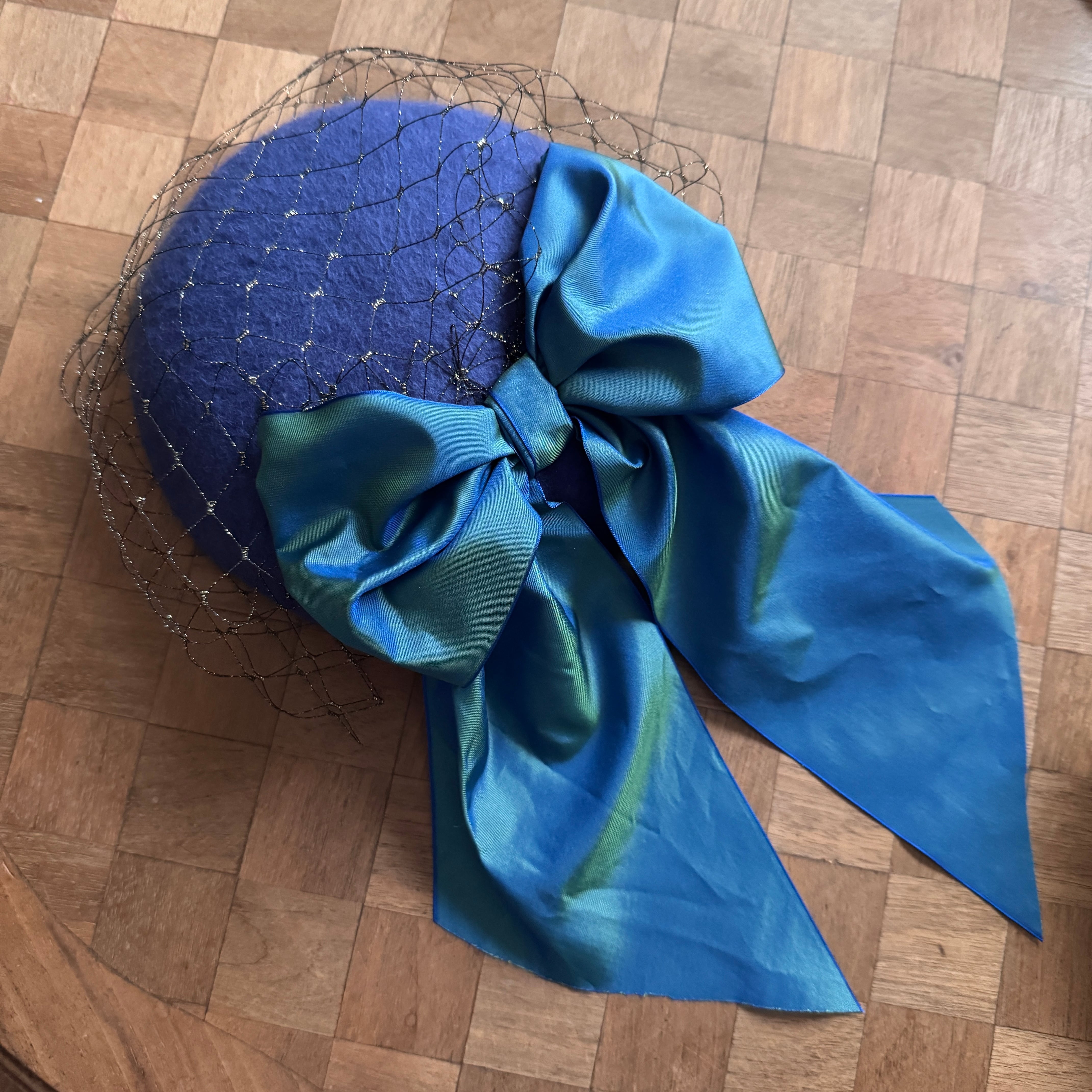トワイライトブルーの軽くて柔らかな国産ベロアのベースに玉虫色のリボン、黒金のベール。 薄明の星空の一片を閉じ込めたようなミニトークです。 ベールは前に垂らす、中にしまう、くしゃくしゃにして一部を出す、など何通りもお楽しみいただけます 特別な日の装いにも日常のワンポイントにもおすすめです。 国産ベロア サイズフリー 全体直径約18cm 最大高さ約3cm コーム付き 国産リボン