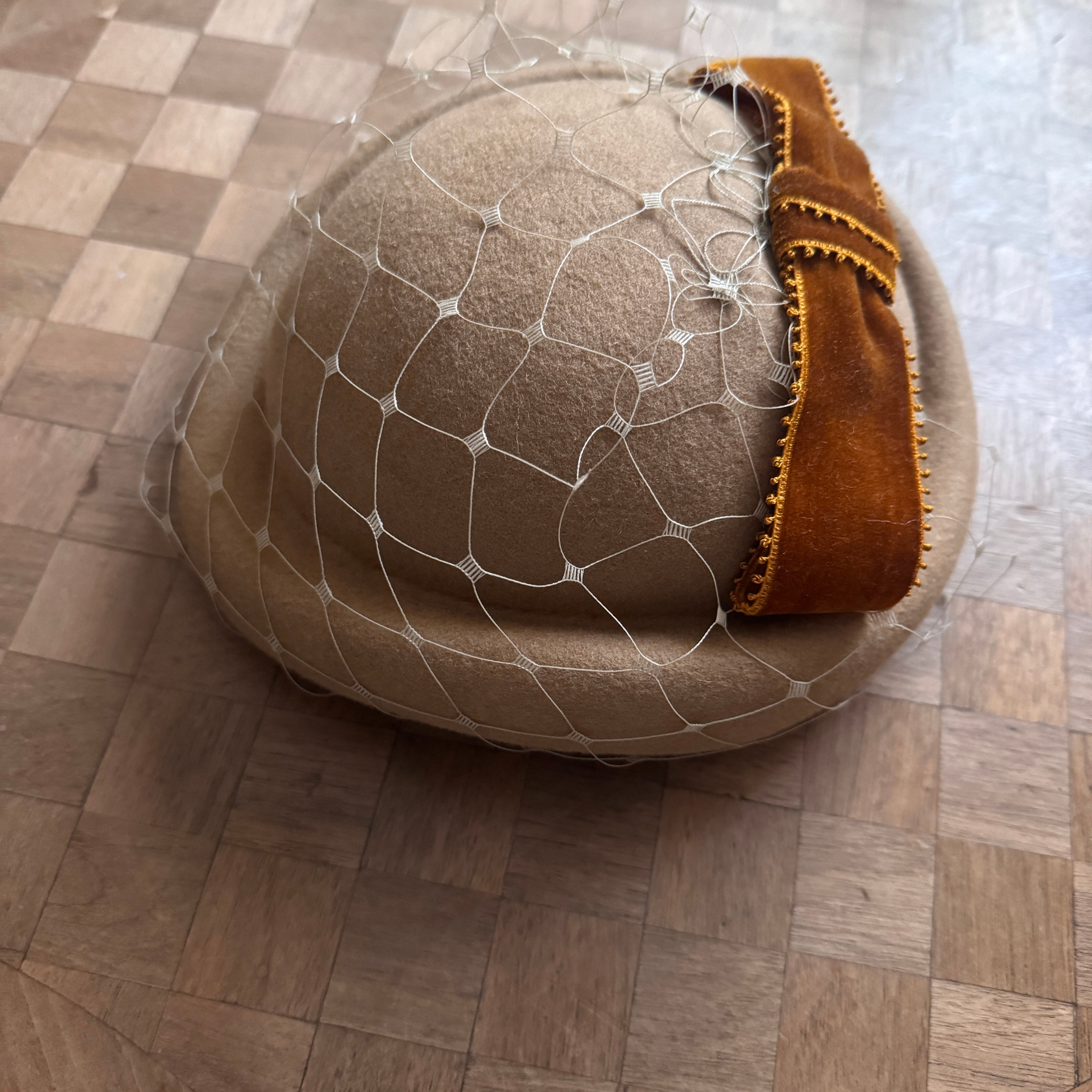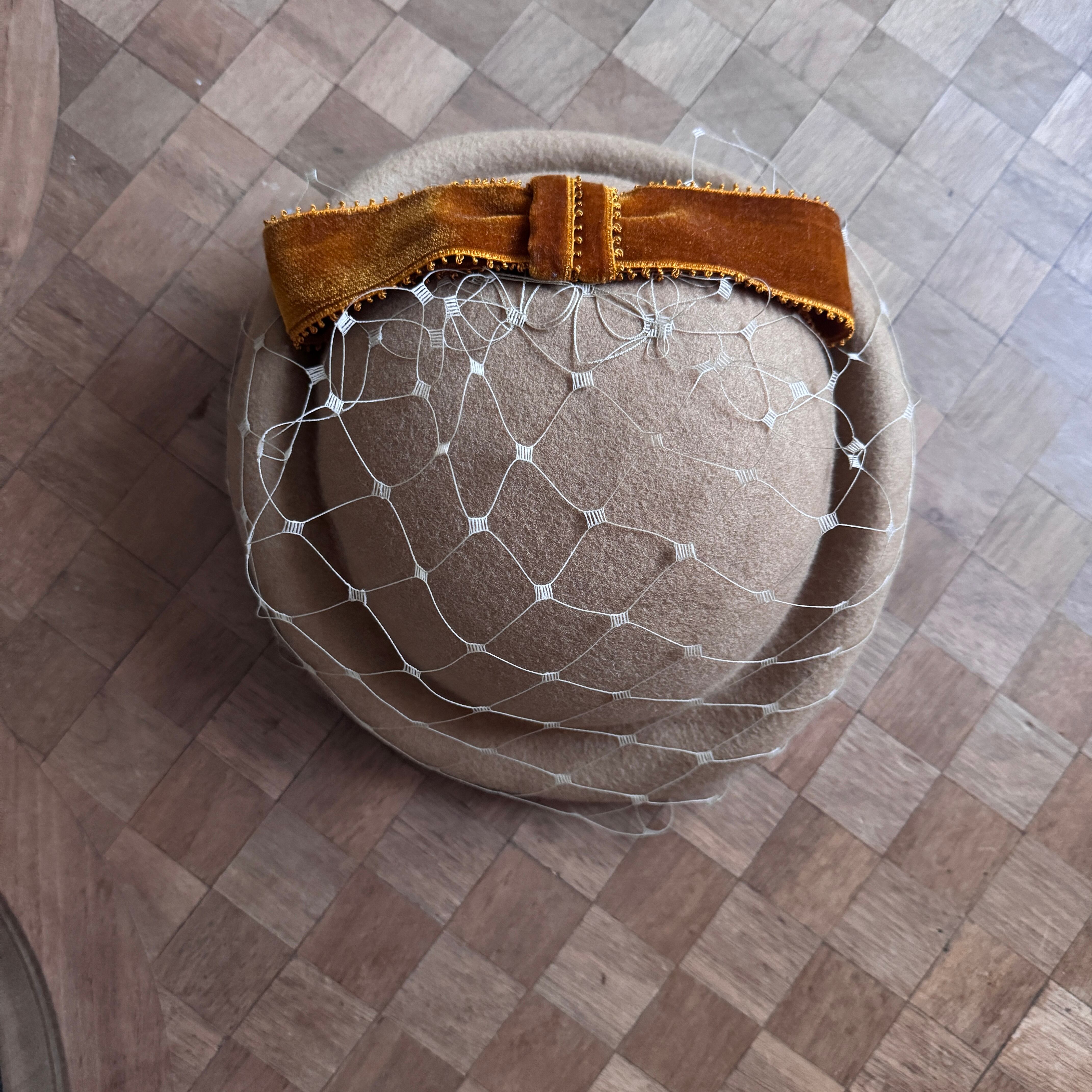 優しいキャメルベージュに、黄金色のベルベットリボンと繊細なチュールベールを組み合わせ、